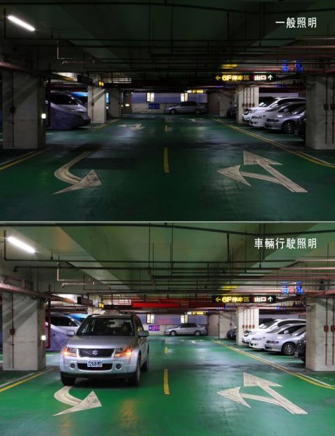 ↓透過停車場內佈署的人車微波感應器,如上方圖片所示無車時車道維持在較暗的亮度,下圖偵測到汽車行駛即自動增加照明亮度。