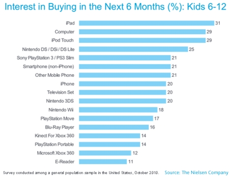 Nielsen最近調查美國消費者未來半年最有興趣購買的電子產品發現,6~12歲的小朋友想要iPad的佔了31%,名列冠軍,因此iPad可以說是今年的最佳聖誕禮物之一。