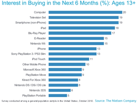 至於13歲以上的消費者的選擇則有些不同,未來半年最想購買的電子產品前十名依序是電腦(20%)、電視(19%)、智慧型手機(19%)、iPad(18%)、藍光播放器(17%)、電子書閱讀裝置(15%)、任天堂的Wii(15%)、iPhone(13%)及任天堂DS/DSi/DS Lite(13%)等。