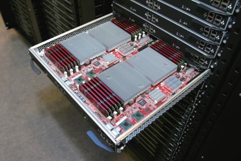 英業達新款貨櫃式機房內建專用伺服器,在一臺1U伺服器內配置兩套主機板,每套主機板有2顆處理器與12個DIMM記憶體插槽,處理器透過冷卻液來散熱,記憶體和其他晶片則透過冷卻背板導入常溫水來散熱。