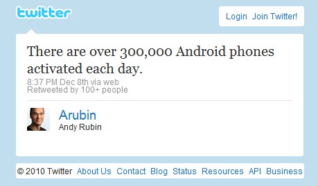 全球每日啟用的Android手機正快速增加。今年4月,Google甫於財報中表示,全球平均每天出售並啟用6萬支Android手機,但8月該數字就成長至20萬,Google工程副總裁Andy Rubin周四(12/9)透過Twitter表示,現在每天啟用的Android手機已超過30萬支。