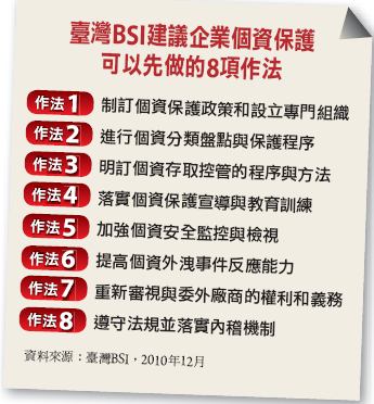 資安驗證公司BSI日前在舉行的年會中,將英國個人資料保護標準BS 10012,根據P(規畫)D(執行)C(稽核)A(改善)的概念,濃縮成8項可實作的摘要作法。臺灣BSI副總經理蒲樹盛表示,BS 10012的個資保護標準和臺灣一樣,都是參考OECD和APCE的隱私權保護綱領及原則,不僅是個資防護最佳實務,也可以作為企業著手部署個資保護推動方案與作法的入門參考。「做完這8點不代表就完成個資保護,但至少可以作為企業開始著手個資保護的起點。」他說。
