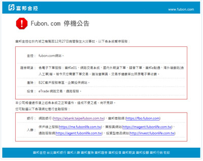 ▼ 富邦金控機房於12月27日晚上9點多失火,造成富邦證卷期貨的各電子下單服務、投信網路交易和通路服務、產險客戶服務網站停擺,甚至到了12月28日中午,富邦金控網站首頁仍顯示停機公告。富邦預估,12月29日可以完全恢復正常運作。