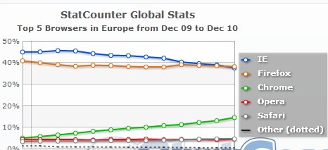 根據StatCounter的數字,去年11月時,IE在歐洲市場還以38.91%領先Firefox的38.5%。不過,在去年12月時,全球的瀏覽器市佔率還是由IE的46.94%奪冠,Firefox的全球市佔率為30.76%,排名第三的是Chrome的14.85%,Safari佔4.79%,Opera佔2.07%。