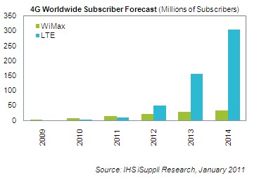 根據iSuppli統計,2010年WiMAX用戶為680萬戶,LTE用戶僅達70萬,預估今年WiMAX用戶數將成長至1490萬,LTE則可以到1040萬。但2012年LTE用戶將達5000萬,開始超過WiMAX的2200萬戶,而且將在2014年以5億戶對3340萬戶,取得九倍以上的領先優勢。