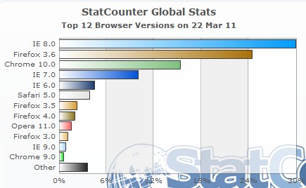 根據StatCounter所公布的資料顯示,Firefox 4在全球瀏覽器的佔有率已經以1.95%勝過IE 9(0.87%),但IE 8、Firefox 3.6仍以約30%及25%分居冠、亞軍。若將各版本加總,IE則以45%勝過Firefox的30%,Chrome以17%排名第三。台灣地區以3/23日的瀏覽器佔有率來看,Firefox 4亦以1.09%略勝IE 9(0.99%),但IE 8、7、6版分別以43.79%、15.72%、14.22%大勝Firefox 3.6的9.87%。
