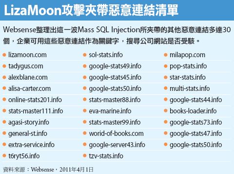 資安廠商Websense在3月29日於該公司部落格發布一則資安通報,有一個名為LizaMoon.com的惡意網址,透過SQL Injection手法被植入許多網站中。根據Websense持續更新的資安報告,透過Google查詢被植入該惡意連結的網址數量,從原本的2萬8千多個,暴增為全球受害遭植入該惡意連結的網址數量超過百萬個的Mass SQL Injection攻擊。