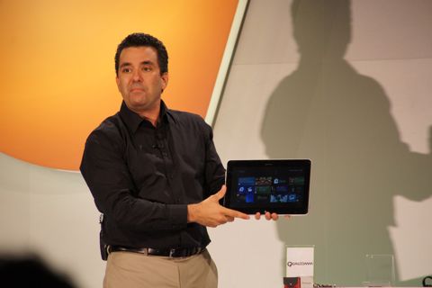 微軟Windows規劃、硬體與PC生態系統副總裁Mike Angiulo展示一款採用ARM架構處理器的平板電腦,上面執行Windows 8作業系統,展現支援ARM裝置的成果。