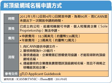 全球網域名稱管理機構(ICANN)20日通過頂級網域名稱新規則,自明年1月開始,為期90天,開放企業以任何字詞及語言申請頂級域名(gTLD),以自有公司或產品名稱取代原先的.com。不過,高達5百多萬元申請費及70多萬元使用年費將成為申請門檻。