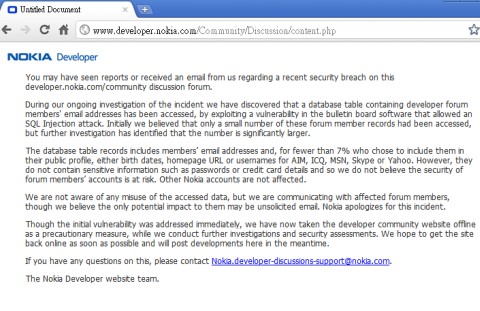 Nokia從週一開始,暫時撤下其開發者論壇,取而代之的是一則遭隱碼攻擊的公告,公告中明確指出該論壇遭受隱碼攻擊(SQL Injection),目前還無法確認多少資料外漏,所幸其資料主要僅含電子郵件信箱,只有7%的使用者輸入生日、個人網址及部分即時通訊方式。