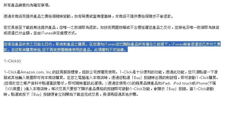「您得自產品收受之日起7日內,取消對產品之購買。在您通知iTunes您已刪除產品所有備份之前提下,iTunes將會退還您已支付之價款。自您取消購買時起,您不再被授權繼續使用該產品。…」