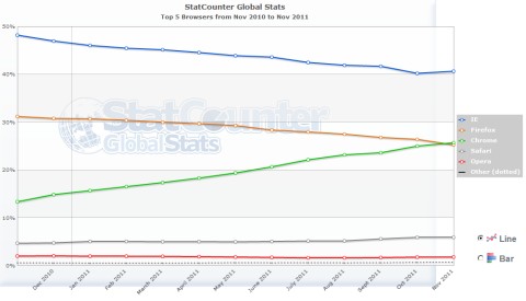 市場調查機構StatCounter今年11月的調查顯示,Chrome在11月的全球市佔率達到25.69%,首度超越了Firefox的25.23%,成為瀏覽器市場的第二把交椅,第一名則是IE的40.63%。