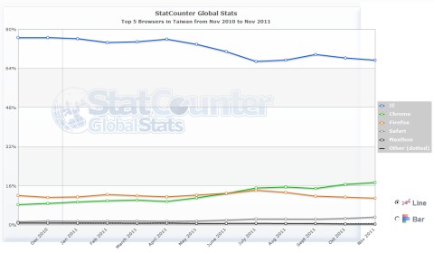 在台灣市場則領先反應了該趨勢,StatCounter的資料顯示,六月時Chrome和Firefox以13%打成平手,但七月時Chrome就以15.1%打敗Firefox的14.2%。到了11月則分別為17.41%,10.95%,IE則為67.36%。
