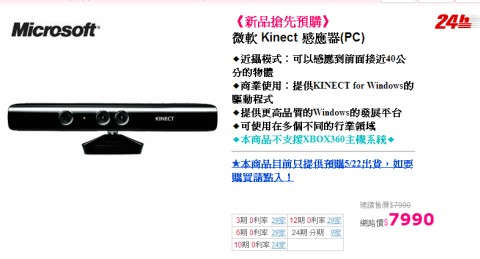 Kinect for Windows在PChome購物顯示預售銷售完畢,並於5月22-24日開始出貨。