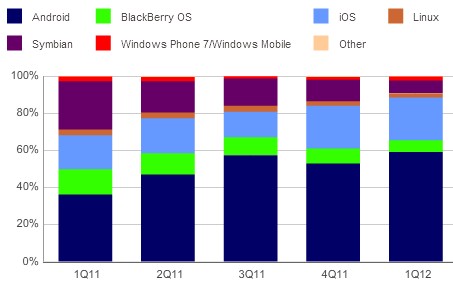 2012年第一季全球智慧型手機出貨量達1億5230萬台,其中Android佔59%約相當於近9000萬台;iOS為23%,相當於3500萬台。兩者市佔總計為82%。相較之下,2011年同期兩大平台的市佔率只有54.4%。
