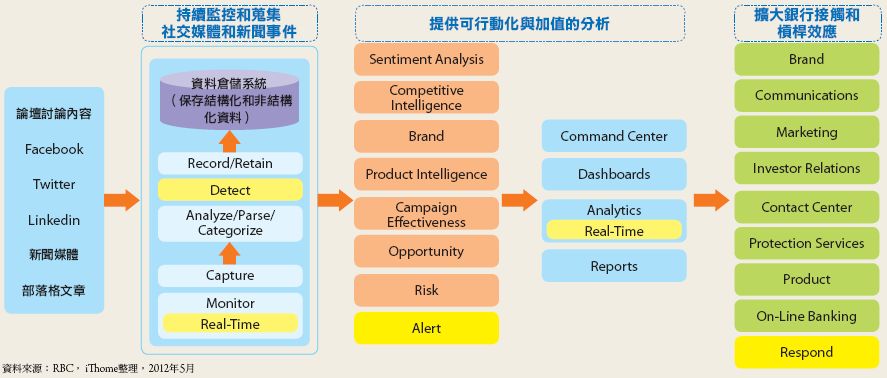 加拿大皇家銀行金融集團RBC企業資訊管理副總裁Mohammad Rifaie表示,即時監控社群網站的言論並進行分析,才能讓企業即時掌握社群網站的言論來採取因應方案,經營企業形象與金融業最重視的信譽,而社群網站資料的分析也讓RBC正式跨足巨量資料(Big data)領域。