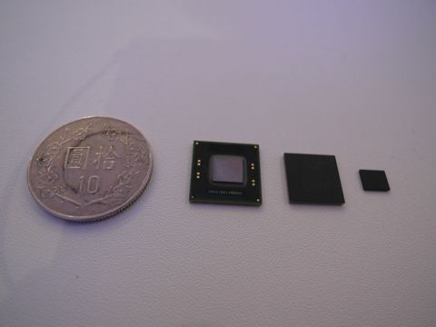 ↓ Tunderbolt控制器晶片,大小比10元硬碟還小,最左邊較大的是第一代晶片,可用於主機端和裝置端,去年蘋果Mac即採用此晶片,最右邊最小的晶片也是第一代產品,主要用於裝置端。中間則是第二代的Thunderbolt控制晶片,整合I/O功能,簡化系統設計,可用於主機和裝置端。