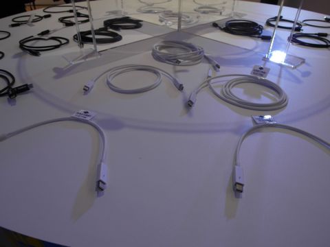 ↓ Thunderbolt可以一條線纜傳輸視訊、資料,線纜分為電氣線材和光纖線材兩種,電氣線材用於短距傳輸,線纜長度多在3至10公尺左右,較長距離則需使用光纖線材,傳輸距離可到30至50公尺。