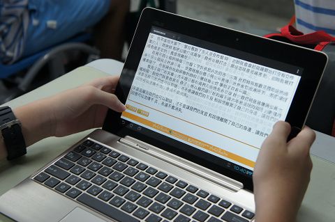 ↓ 華碩四核心變形平板電腦應用在電子書包教學實驗上,好處在於學生可依上課需要彈性的在平板電腦、筆電兩種模式間切換,不過變形平板含鍵盤基座在內價格1.7萬元左右,對學校採購設備的成本較高,而使用四核心高規格平板電腦大多為遊戲、多媒體效能上需求,e化教學使用上的必要性有待評估。