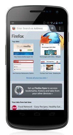 Firefox 14 for Android是Mozilla首個採用Android原生使用者介面的行動版本瀏覽器,在此之前Firefox使用XUL架構使用者介面。其他的新功能包含全新設計的起始頁、支援Flash、不追蹤(Do Not Track)按鈕、書籤與瀏覽記錄同步等。
