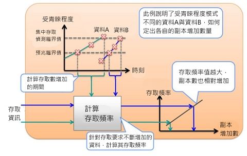 透過富士通研究所動態調整副本數量(Adaptive Replication Degree)機制,讓系統自動分析檢測現有資料受青睞程度與是否產生集中存取現象,並在確認無誤後增加持有副本的伺服器數量,盡量大範圍的將存取要求資料擴散至所有伺服器,以防止上述網路塞車現象。若進一步應用於難以預測存取模式(access pattern)的ICT資通訊技術系統中亦可加強其使用穩定性。