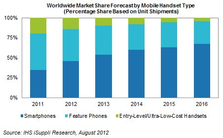 IHS將手機市場分成智慧型手機、功能手機,及入門級的低價手機,在所預測的2011~2016年間,只有智慧型手機的出貨量陸續成長,功能手機與低價手機都逐步下滑。例如雖然目前功能手機的出貨量仍大於智慧型手機,但到了2012年底,智慧型手機的出貨量便會趕上功能性手機,到了2016年,智慧型手機將佔整體出貨量的67.4%,屆時功能性手機的出貨量佔比將只有28%,而低價手機的市佔率也將從2011年的14%跌到2016年的4.2%。