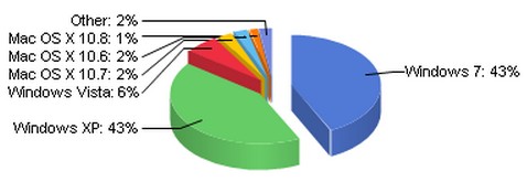 Net Applications的數據則顯示,IE 8是目前所有瀏覽器版本中市佔率最高的,達25.27%,其次則是IE 9的18.4%。而在作業系統的市佔率方面, Windows 7也才剛追過Windows XP成為最受歡迎的作業系統,兩者的市佔率分別為42.76%與42.52%。