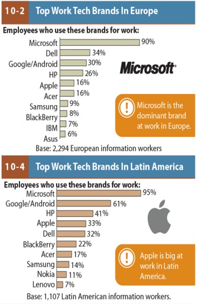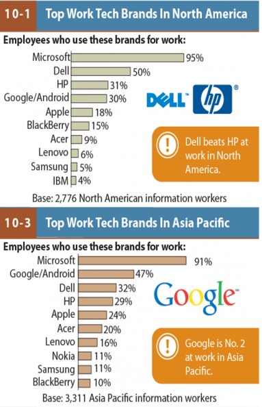 Forrester一份針對全球一萬名資訊工作者的調查中發現,工作上最常使用的裝置、作業系統,或是軟體品牌中,微軟還是居主導地位,有90%的人工作上都要使用到微軟的技術。但蘋果與Google已擠進前五名,甚至在許多地方都開始追過戴爾(Dell)和惠普(HP)等PC大廠。