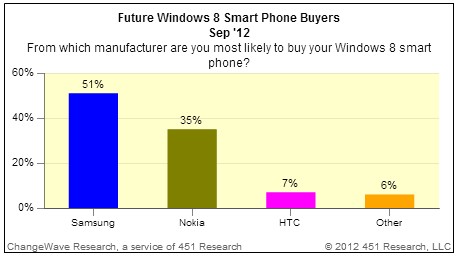 另一方面,由於微軟也即將發表新的Windows Phone 8手機作業系統,包括宏達電(HTC)、Nokia,及三星(Samsung)也都將推出新機。ChangeWave對此的調查則顯示,只有2%消費者很想買,有點想買的則是7%,兩個數字加起來才9%,而最想買的Window Phone 8手機有過半都是想買三星(51%)的機型,35%為Nokia。