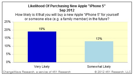 對於未來是否可能購買iPhone 5的問題,有將近三分之一(32%)的受訪者表示可能購買,其中「很可能購買」的達19%,「有點想買的」(Somewhat Likely)則有13%。相較之下,iPhone 4S上市時(2011年10月)的數字只有21.5%的人想買,而很想買的只有10%,有點想買的是11.5%。「很想買」iPhone 5的消費者比例幾乎比iPhone 4S多了一倍。