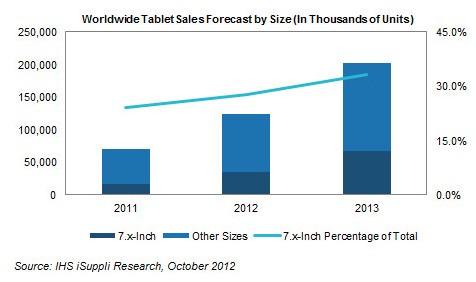 根據IHS的研究,7吋平板在總體平版市場中的比重不斷在增加,預估2012年將達到24%的比例,2013年達到33%。