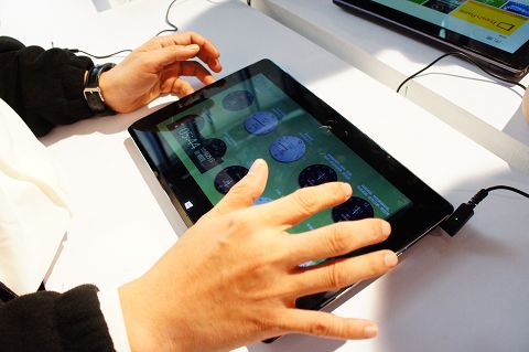 ↓ 支援觸控螢幕的All in one電腦可將螢幕180度平放在桌上,供多人一同分享使用,例如多人共同玩觸控類型的遊戲。