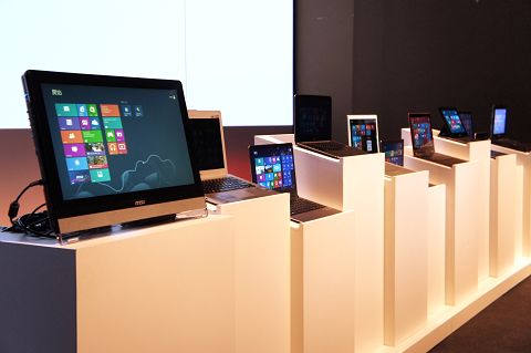 ↓ 微軟宣稱目前已有超過100款電腦產品搭載Windows 8,除了現有機種換裝Windows 8之外,也有部份產品採用全新設計,包括內建觸控的超輕薄筆電、變形平板、平板電腦、All in one電腦。