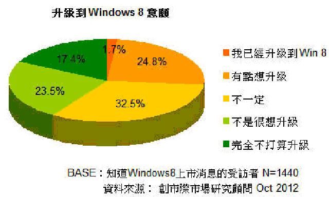 市調公司創市際針對網友進行微軟Windows 8認知的線上調查,發現知道Windows 8上市的網友中約四分之一想昇級,而有3成網友對採用新系統抱持著觀望的態度。