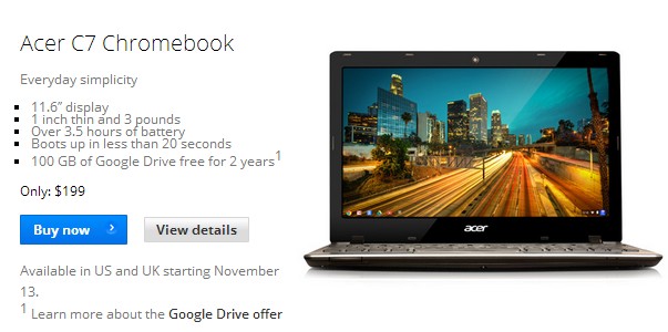 繼今年10月推出由三星打造的249美元低價Chromebook之後,Google周一(11/12)再度發表宏碁所製造的C7 Chromebook,而且要價只要199美元。