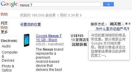 ↓ Google購物搜尋結果頁面的右上角有一連結說明廣告主的付費會影響產品搜尋排序。
