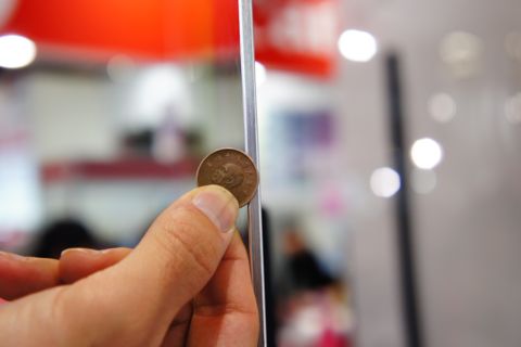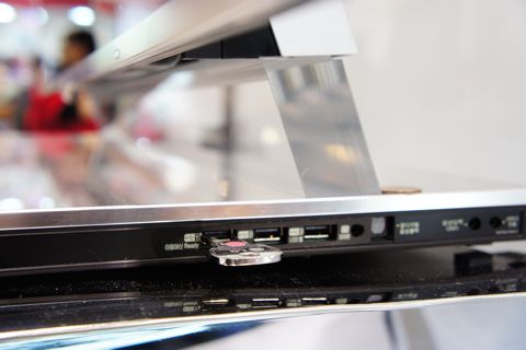 ↓國內首次亮相的LG 55吋OLED TV,厚度只有4mm,比台幣1元還薄許多,所有的連接介面,例如USB、HDMI均內建在電視底座上,目前OLED在大呎吋電視面板上良率問題,該款OLED TV明年才會推出。