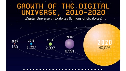 2012年全球建立或複製的資料量為2.8ZB,但隨著全球PC與智慧型手機的普及、愈來愈多的網路存取、更多由監視器或智慧電表等機器所產生的數據都將讓全球的數位資料量快速成長,在2020年達到40ZB。其中,由機器產生的資料量比例將從2005年的11%成長到2020年的40%。