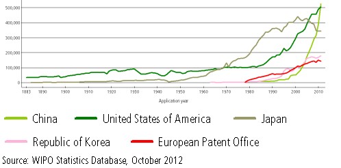 世界智慧財產權組織(World Intellectual Property Organization, WIPO)最新公布的「2012年全球智財權指標報告」(World Intellectual Property Indicators 2012)指出,中國智財局所接受的專利申請數連續追過日本及美國,在2011年成為世界第一,但若以申請者的居住國籍來看,日本人是全世界申請專利最多的。(完整報告下載)