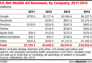 eMarketer估計今年美國包括陳列式、搜尋及採用訊息格式並支援智慧型手機與平板電腦的行動廣告將會成長180%,達到38.3億美元的規模。今年9月該機構原本預測今年的行動廣告營收是26.1億美元,成長率只有80%。