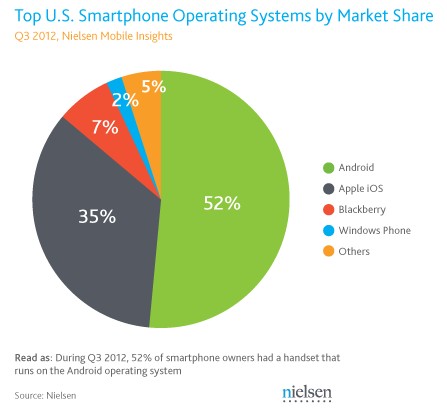 根據Nielsen今年第三季的調查,美國最多人使用的智慧型手機平台為Google Android,市佔率達52%,高於iOS的35%及黑莓的7%。