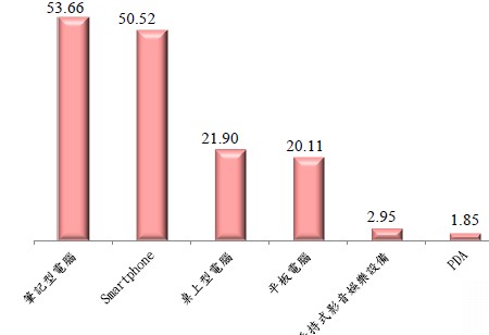 使用的無線上網設備,以筆記型電腦及智慧型手機的比例最高,相對次數分別為53.66人次與50.52人次。相較之下2011年筆記型電腦以74.33遠高於智慧型手機的25.58,顯示2012年許多人無線上網改以智慧型手機取代筆記型電腦。調查也發現,擁有筆記型電腦、智慧型手機,或平板電腦等隨身連網設備者達55.26% 。