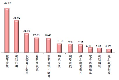 使用行動上網之情境以「急於查詢資訊」和「無聊打發時間用」(相對次數:61.89人次及57.99人次)為最多。場合則是以「搭家用車/計程車/遊覽車」(相對次數:53.02人次)最多,其次為在「室內行進中(相對次數:46.01人次)」,再其次為「搭火車」、「搭捷運」與「戶外行進中」(相對次數分別為:31.70人次、30.74人次與30.47人次)。