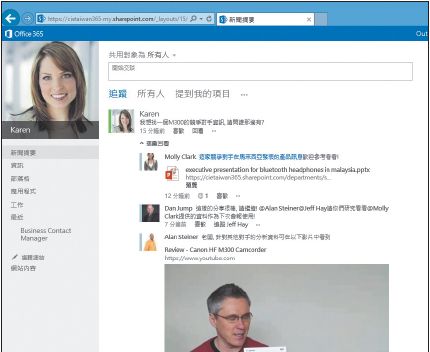 新版SharePoint 2013介面延續微軟Windows 8風格,首頁有即時顯示的社群訊息等,此外,企業在SharePoint 2013上所發布的文件、檔案等,也都可以整合在Yammer平臺上發布。