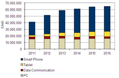 IDC Japan發表日本2012年第3季(7~9月)行動裝置出貨量與市場規模報告。該季智慧型手機出貨量797萬支比去年同期成長50.2%,平板電腦出貨量101萬台,成長106.8%。以廠商市佔率來看,蘋果電腦不論在智慧型手機或平板電腦均為第一,但以作業系統市佔率來看則是Android OS勝出。
