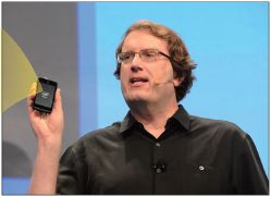 ![]() 英特爾副總裁暨行動與通訊事業群總經理Mike Bell在國際消費電子大展上展示內建英特爾最新Atom系列處理器的智慧型手機參考樣式。 |