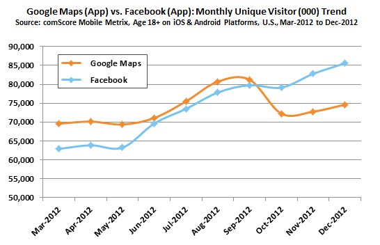 comScore執行此一調查的期間為2012年的3月到2012年的12月,Google Maps原本一直領先Facebook,一直到9月才被Facebook超越。