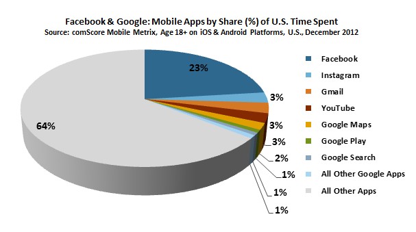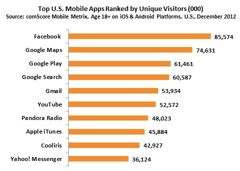 即使第一名的位置被Facebook取代,但Google仍是行動應用程式的大贏家,在最多人造訪的前六大行動程式中,Google即佔了從第二名到第六名的5個位置,依序是Google Maps、Google Play、Google Search、Gmail與YouTube等,其他在前十大排行榜內的行動程式還有Pandora、iTunes、Coolris與Yahoo! Messenger。
