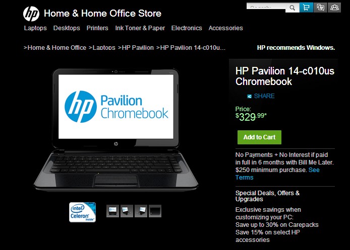 惠普(HP)意外於該公司的線上購物網站揭露了新款的Chromebook─HP Pavilion Chromebook 14-c010us,售價為329.99美元的14吋Chromebook預計於2月17日出貨。不過隨後該網頁已被移除,僅能透過Google搜尋的頁庫存檔功能尋得。