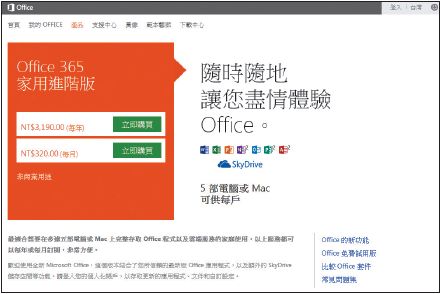 Office 365方案也分為幾種版本。適合一般家庭用戶的Office 365家用進階版售價為年費3,190元或月費320元,包含Word、Excel、PowerPoint和OneNote、Publisher、Access和Outlook等,更有每月免費60分鐘的Skype通話時間,而除基本的7GB SkyDrive雲端儲存空間外,再附贈免費的20GB,總共27GB。Office 365家用進階版可以安裝在5臺電腦上。